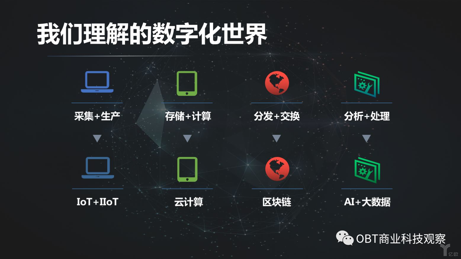 我们对数字化世界的未来有一个基本认识:无论是公链、联盟链还是私链,我们认为整个过程都是围绕着数据的流动性,可以简单分成四个部分:采集+生产、存储+计算、分发+交换、分析+处理。区块链在分发+交换这层,实际上,下一代是整个计算架构里面专门提供路由交换和分成协议。